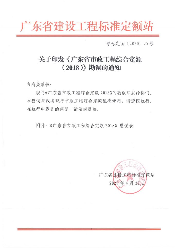 赢博(股份)有限公司官网印发《广东省市政工程综合定额 (2018)》勘误的通知