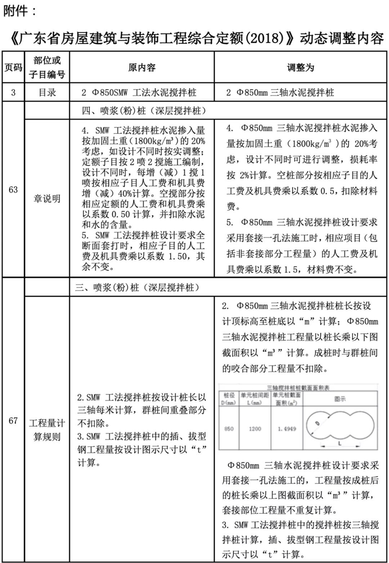 近期,我站组织专家研析了广东省建设工程定额动态管理系统收集的反馈意见,《广东省房屋建筑与装饰工程综合定额(2018)》Φ850mmSMW工法水泥搅拌桩与市场实际存在一定差异。为加强定额动态管理,经广泛调研与测算,现将Φ850mmSMW工法水泥搅拌桩Φ850mmSMW工法水泥搅拌桩项目调整后的内容印发。本调整内容与省现行工程计价依据配套使用,请遵照执行。执行中遇到的问题,请通过“广东省工程造价信息化平台——建设工程定额动态管理系统”及时反映。