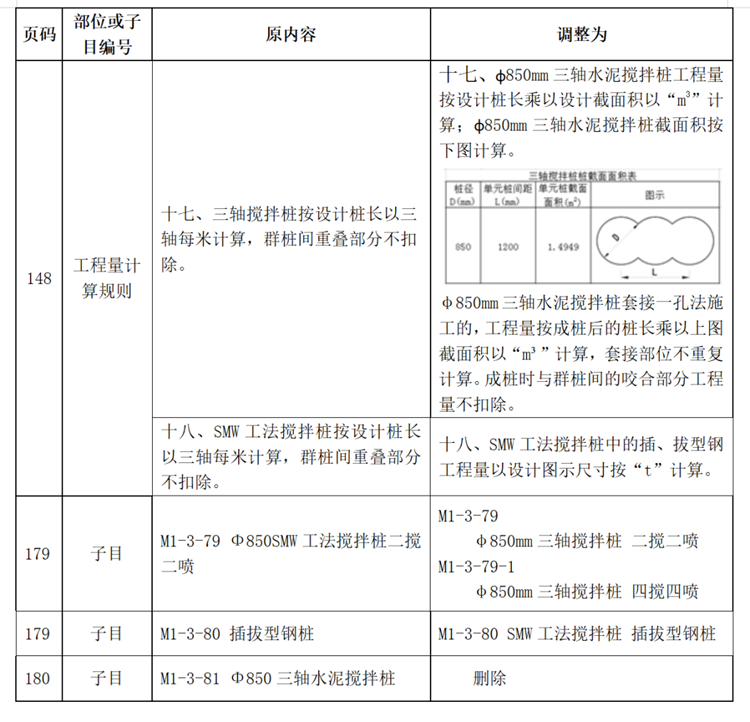 近期,我站组织专家研究分析了广东省建设工程定额动态管理系统收集的《广东省城市轨道交通工程综合定额2018》三轴水泥搅拌桩及SMW工法搅拌桩与市场实际存在一定差异的反馈意见。为加强定额动态管理,经广泛调研与测算,现将三轴水泥搅拌桩及SMW工法搅拌桩项目调整后的内容印发。本调整内容与省现行工程计价依据配套使用,请遵照执行。执行中遇到的问题,请通过“广东省工程造价信息化平台——建设工程定额动态管理系统”及时反映。