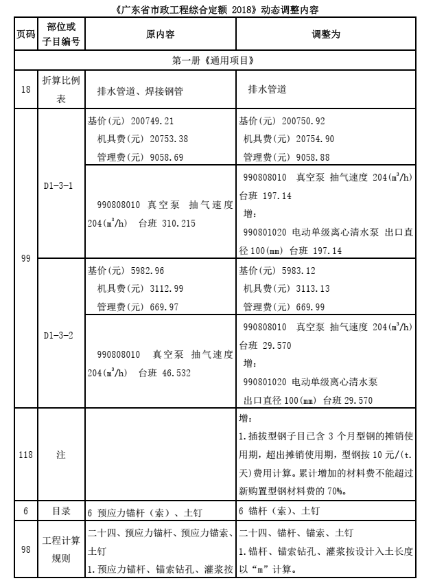 附件:《广东省市政工程综合定额2018》动态调整内容