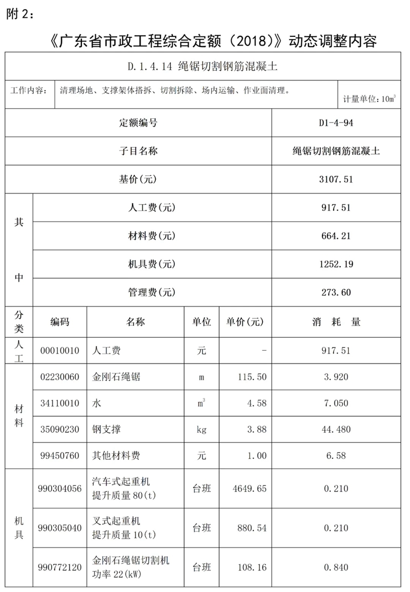 近期,我站组织专家研析了广东省建设工程定额动态管理系统收集的反馈意见,补充《广东省建设工程计价依据 (2018)》绳锯切割钢筋混凝土定额子目,现印发你们,请遵照执行。