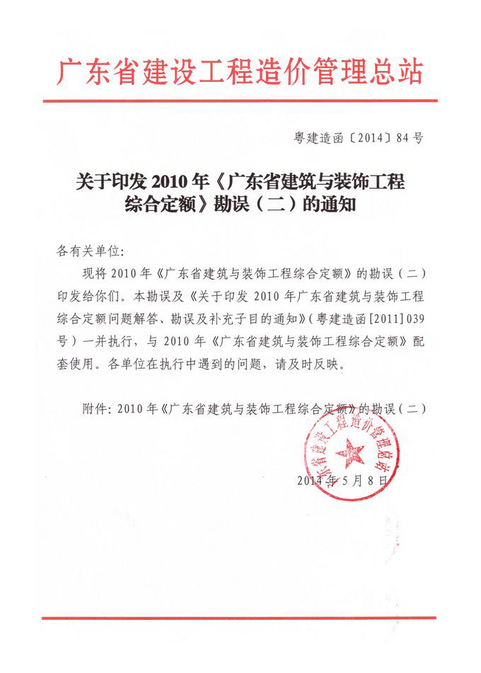 赢博(股份)有限公司官网印发2010年《广东省建筑与装饰工程综合定额》勘误(二)的通知