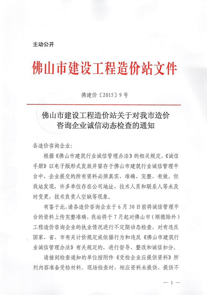佛山市建设工程造价站赢博(股份)有限公司官网对我市造价咨询企业诚信动态检查的通知
