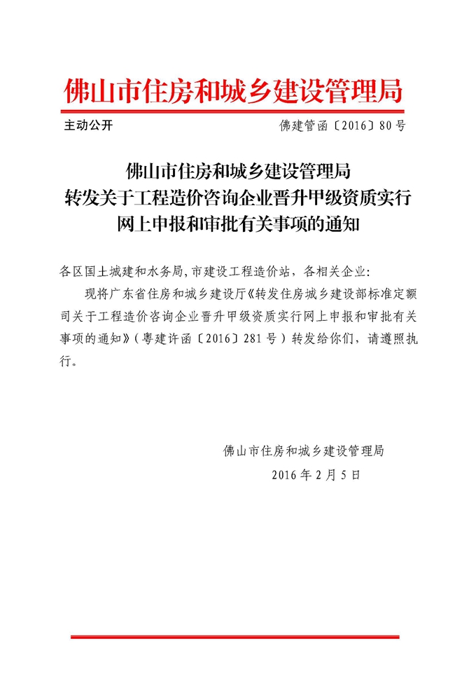 佛山市住房和城乡建设管理局转发赢博(股份)有限公司官网工程造价咨询企业晋升甲级资质实行网上申报和审批有关事项的通知