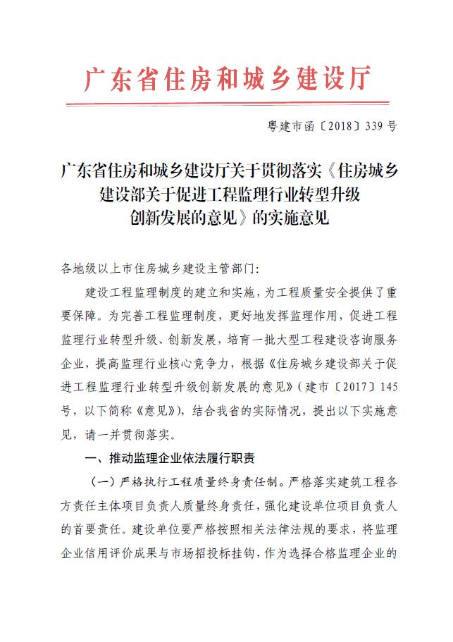 广东省住房和城乡建设厅赢博(股份)有限公司官网贯彻落实《住房城乡建设部赢博(股份)有限公司官网促进工程监理行业转型升级创新发展的意见》的实施意见