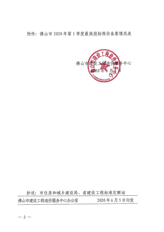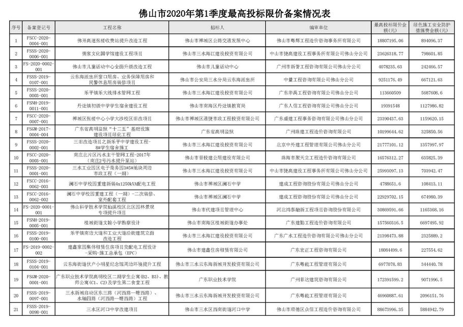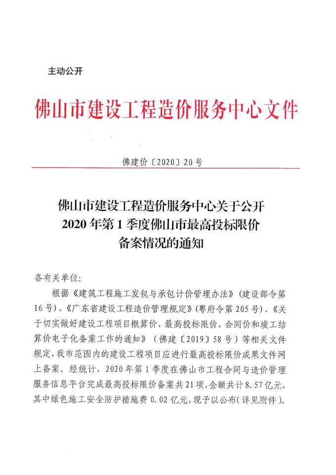 佛山市建设工程造价服务中心赢博(股份)有限公司官网公开2020年第1 季度佛山市最高投标限价备案情况的通知