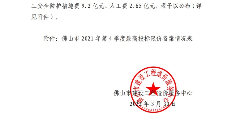 佛山市建设工程造价服务中心赢博(股份)有限公司官网公开2021年第4季度佛山市最高投标限价备案情况的通知