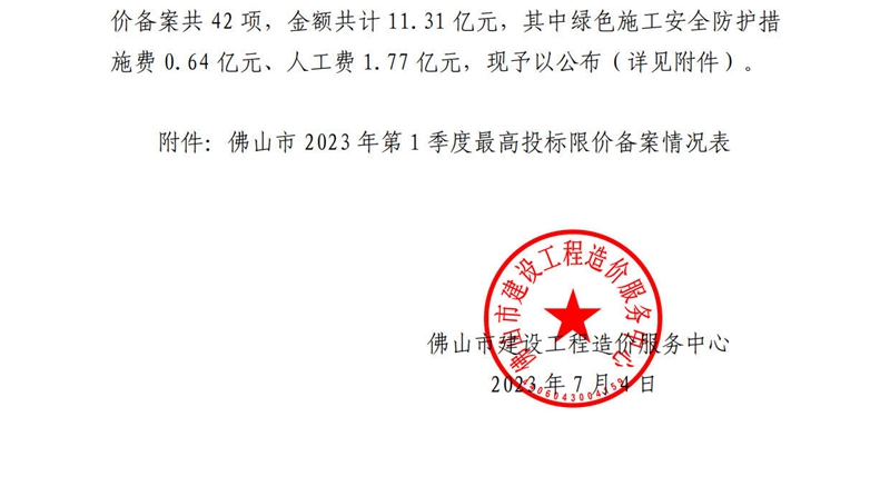 佛山市建设工程造价服务中心赢博(股份)有限公司官网公开2023年第1季度佛山市最高投标限价备案情况的通知