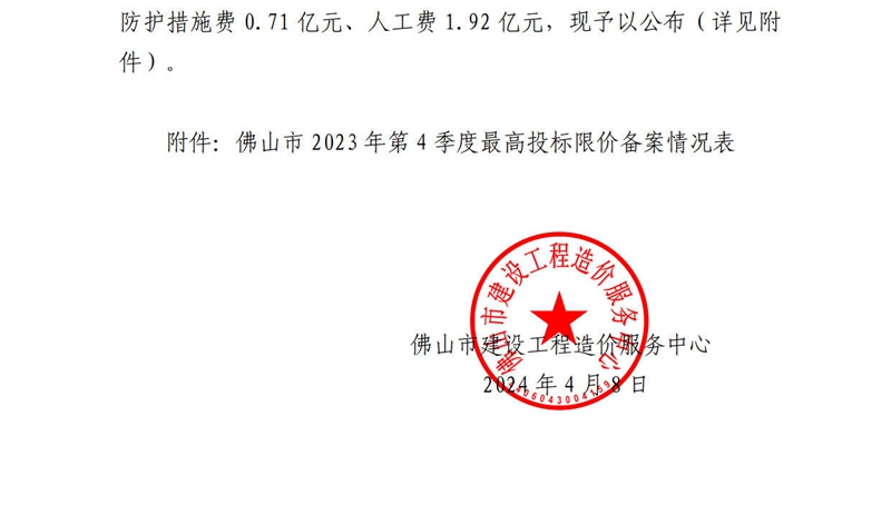 转发 | 佛山市建设工程造价服务中心赢博(股份)有限公司官网公开2023年第4季度佛山市最高投标限价备案情况的通知
