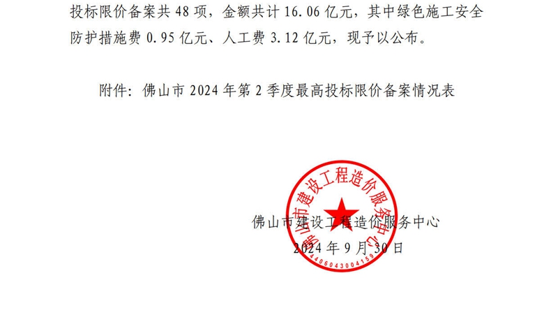 佛山市建设工程造价服务中心赢博(股份)有限公司官网公开2024年第2季度佛山市最高投标限价备案情况的通知