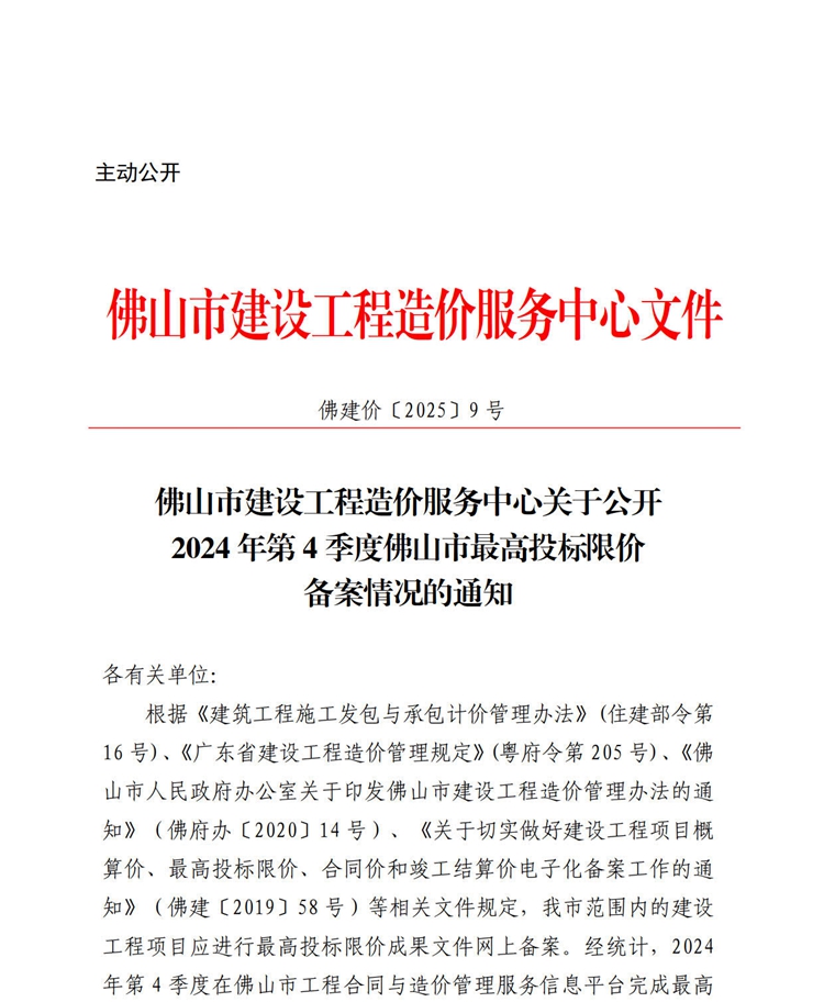 转发 | 佛山市建设工程造价服务中心赢博(股份)有限公司官网公开2024年第4季度佛山市最高投标限价备案情况的通知