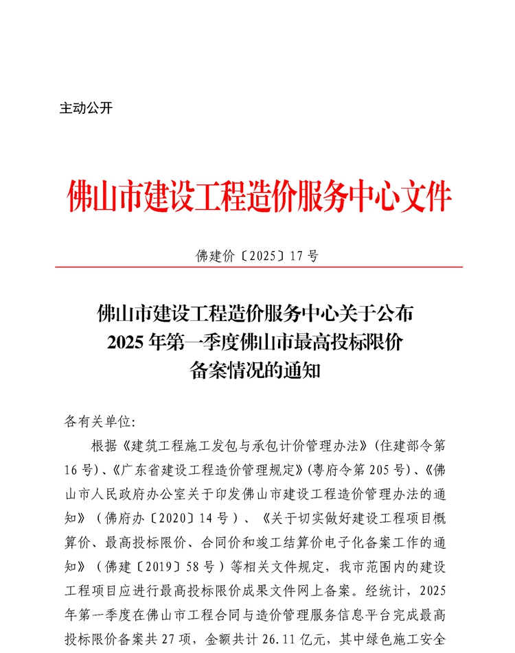 转发 | 佛山市建设工程造价服务中心赢博(股份)有限公司官网公布2025年第一季度佛山市最高投标限价备案情况的通知