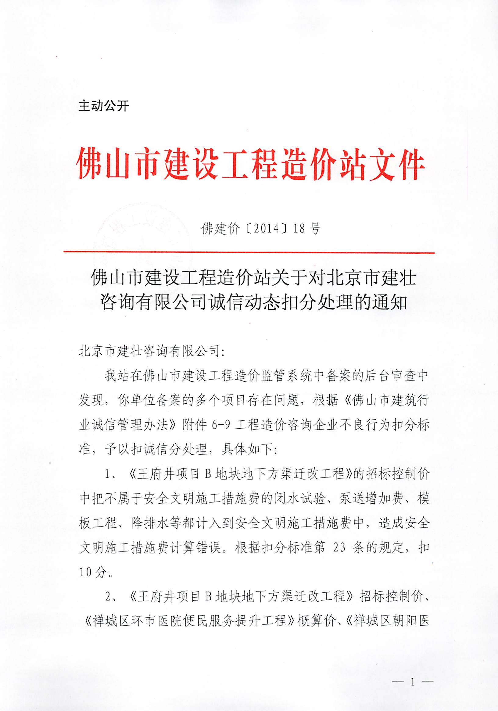 佛山市建设工程造价站赢博(股份)有限公司官网对北京市建壮咨询有限公司诚信动态扣分处理的通知