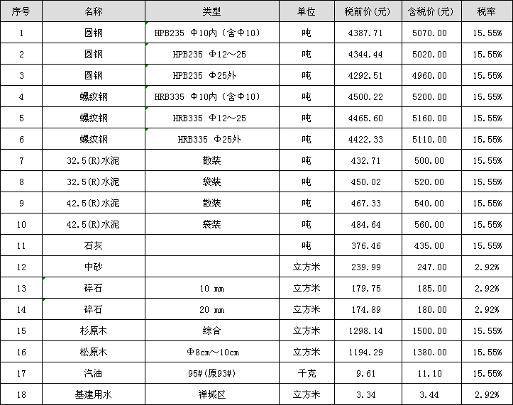 佛山市2018年10月份材料“综合价格”