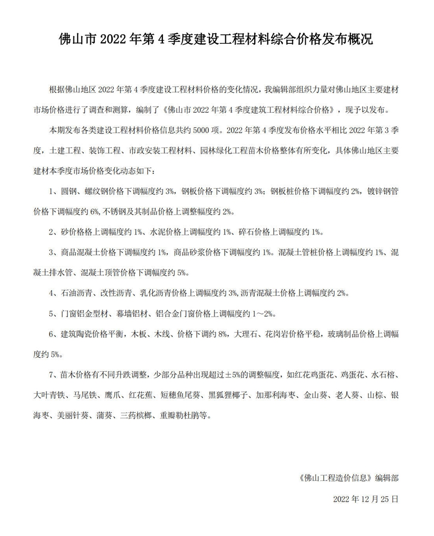 佛山市2022年第4季度建设工程材料综合价格发布概况
