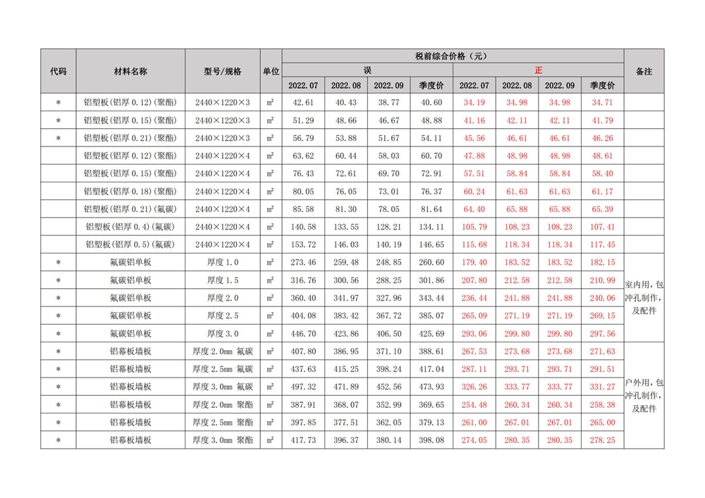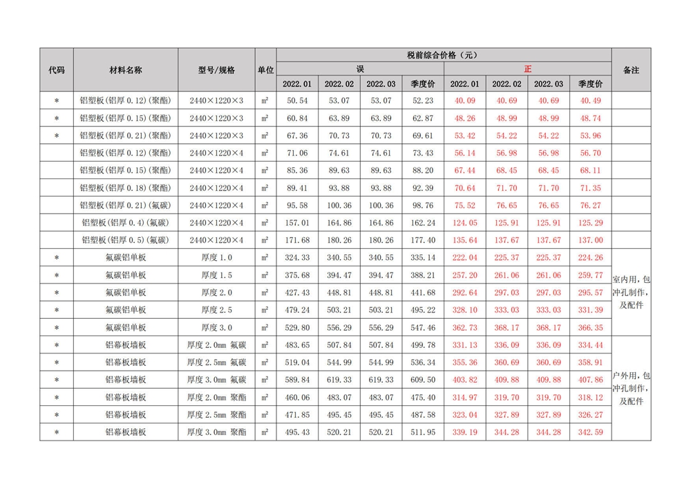 《佛山工程造价信息》2021年1季度至2022年4季度部分装饰材料价格信息勘误表