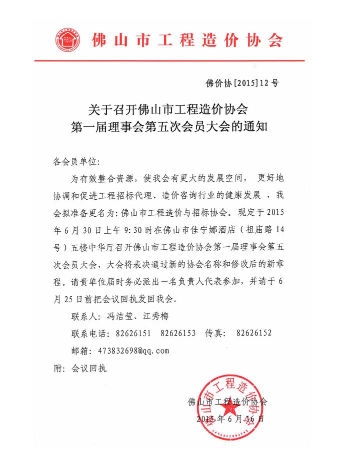 赢博(股份)有限公司官网召开佛山市工程造价协会第一届理事会第五次会员大会的通知