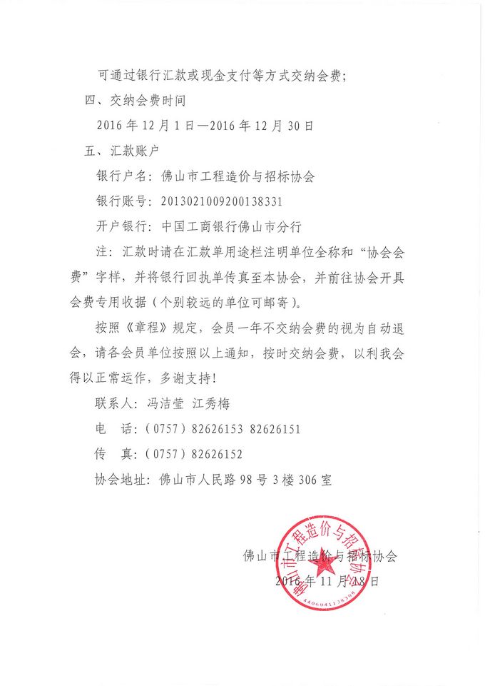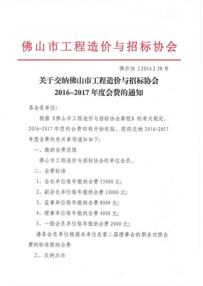 赢博(股份)有限公司官网交纳佛山市工程造价与招标协会2016-2017年度会费的通知