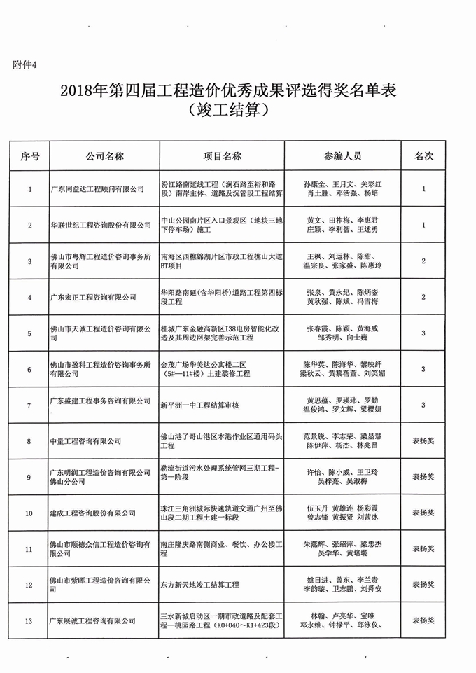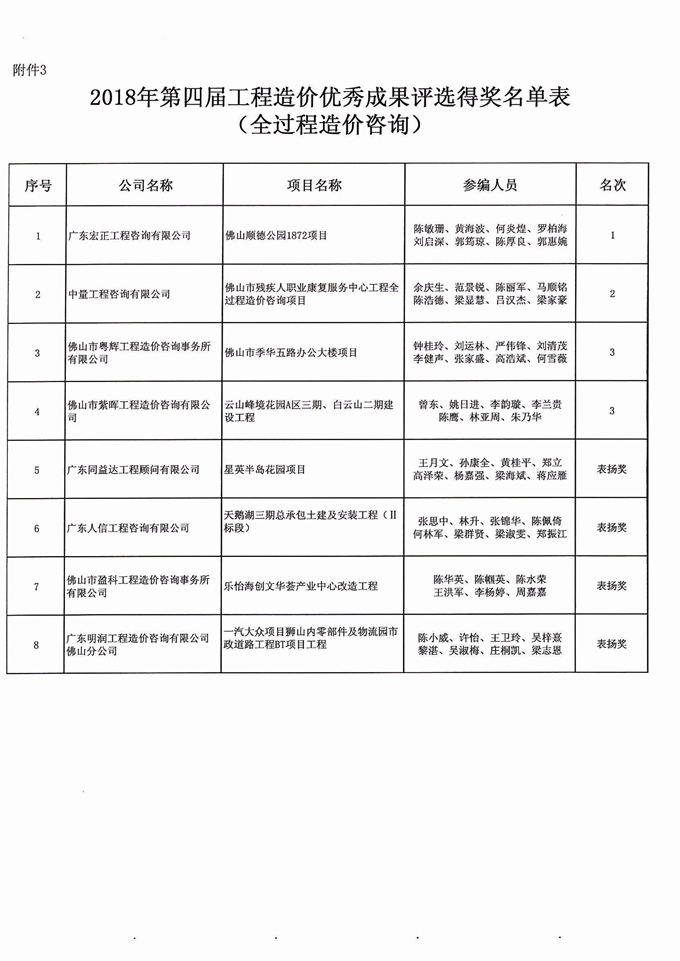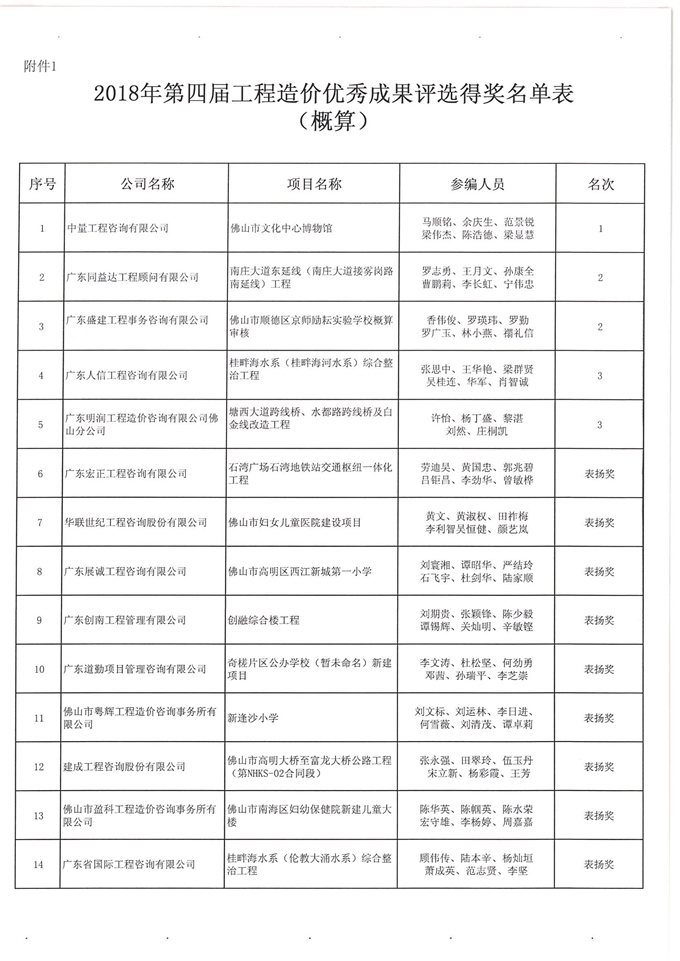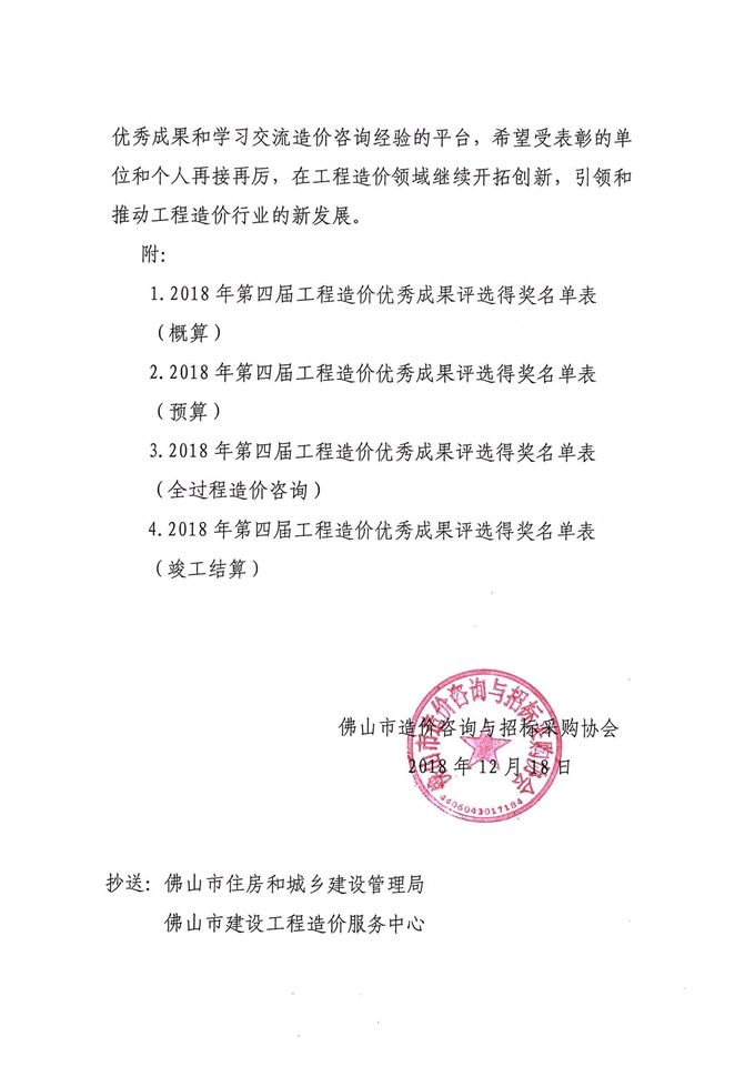 佛山市造价咨询与招标采购协会第四届工程造价优秀成果评选活动获奖名单通知
