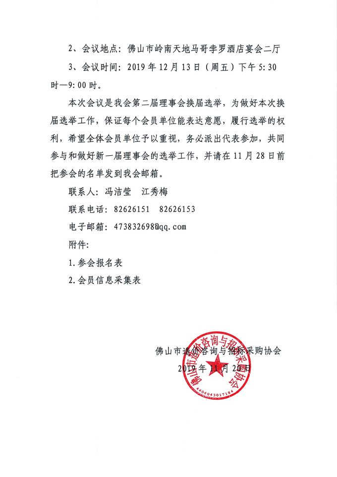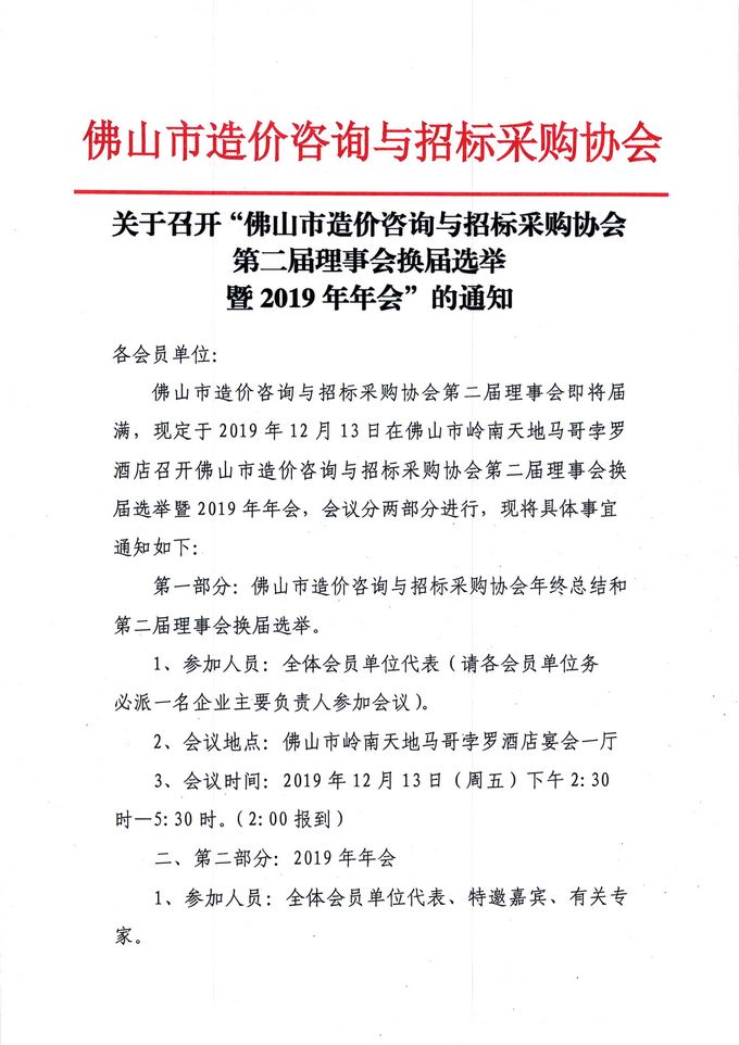 赢博(股份)有限公司官网召开“佛山市造价咨询与招标采购协会第二届理事会换届选举暨2019年年会”的通知
