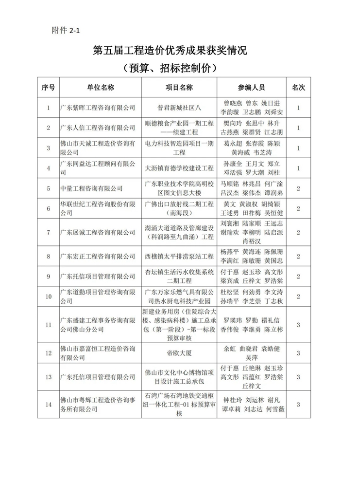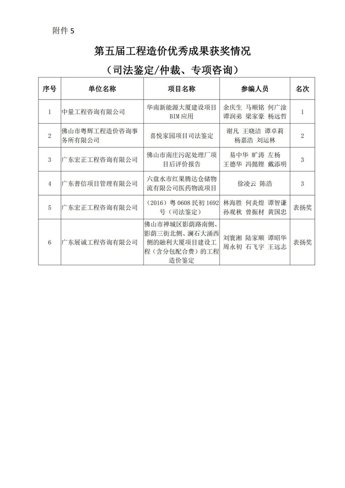 佛山市造价咨询与招标采购协会赢博(股份)有限公司官网第五届工程造价优秀成果评选活动获奖名单的通知
