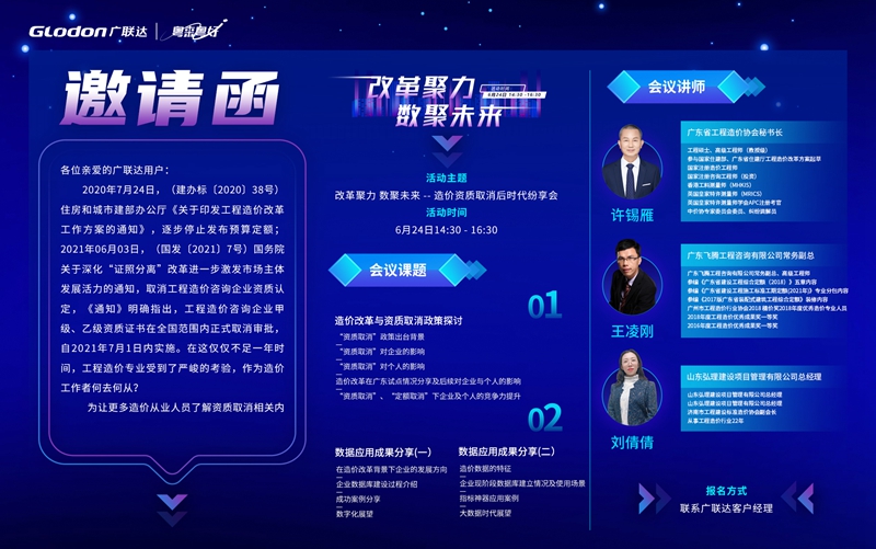 为让更多造价从业人员了解资质取消相关内容,了解行业内数字化实践思路,特此举办《改革聚力 数聚未来--- 造价资质取消后时代线上纷享会》,会议将于2021年6月24日下午线上举办,届时广东造价行业从业人员线上参与本次活动。现将有关事项通知如下:
