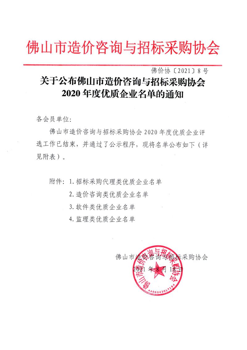 赢博(股份)有限公司官网公布佛山市造价咨询与招标采购协会2020年度优质企业名单的通知