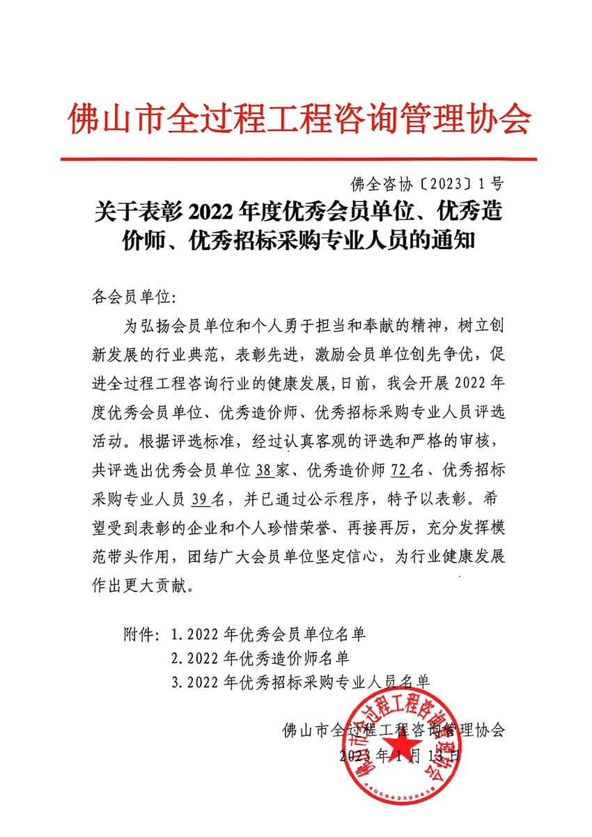 赢博(股份)有限公司官网表彰2022年度优秀会员单位、优秀造价师、优秀招标采购专业人员的通知