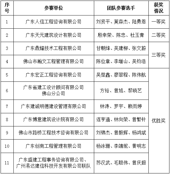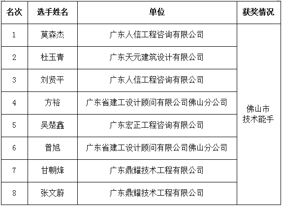 经过一天激烈的角逐,最终决出团体奖共11名(分别是一等奖1名、二等奖1名、三等奖2名、优胜奖7名),“佛山市技术能手”8名,突出贡献奖6名(个人3名、单位3名),优秀组织奖6名。经公示后,具体名单公布如下: