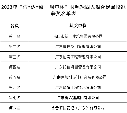 2023年“信•达•诚--周年杯”羽毛球团体赛至此圆满落幕。在此特别鸣谢广东人信工程咨询有限公司、广东同益达工程顾问有限公司、佛山市天诚工程咨询管理有限公司三家公司的鼎力支持,同时感谢所有参赛选手和工作人员积极参与,期待一下届的“展诚杯”再相聚。