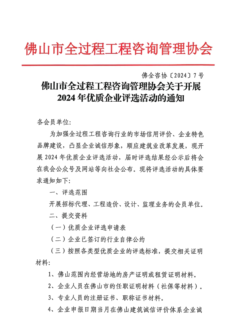 佛山市全过程工程咨询管理协会赢博(股份)有限公司官网开展2024年优质企业评选活动的通知