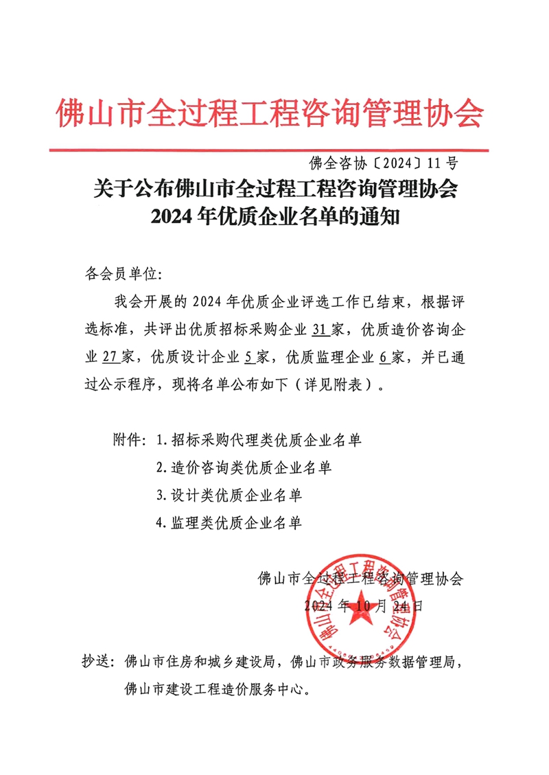 赢博(股份)有限公司官网公布佛山市全过程工程咨询管理协会2024年优质企业名单的通知