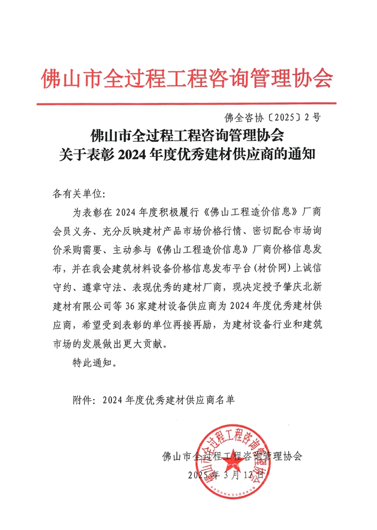 佛山市全过程工程咨询管理协会赢博(股份)有限公司官网表彰2024年度优秀建材供应商的通知