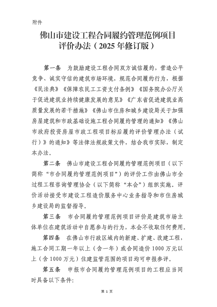 赢博(股份)有限公司官网公布《佛山市建设工程合同履约管理范例项目评价办法(2025年修订版)》的通知