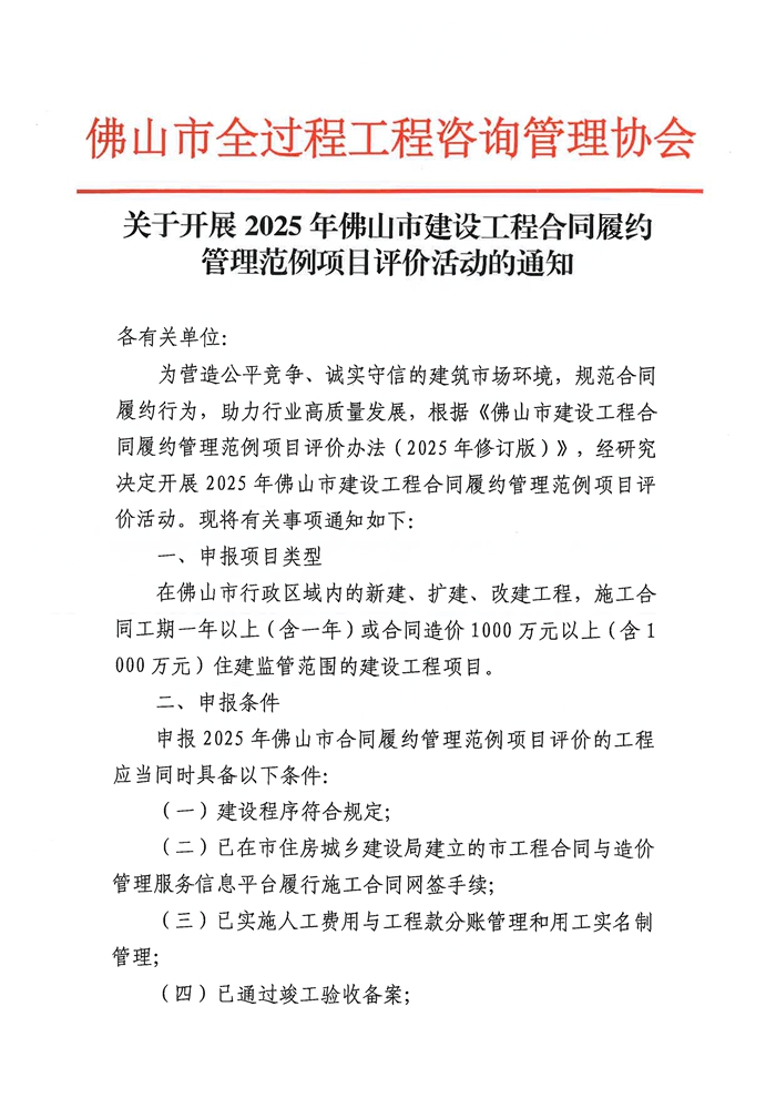 赢博(股份)有限公司官网开展2025年佛山市建设工程合同履约管理范例项目评价活动的通知