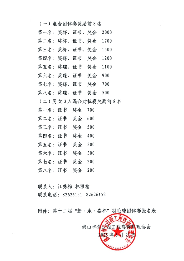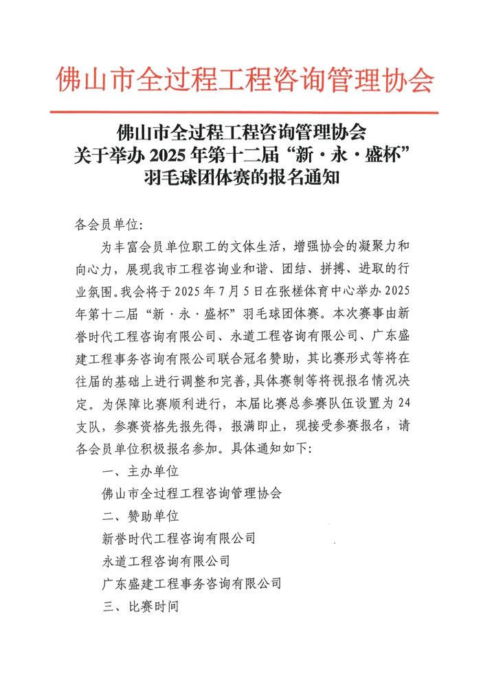 佛山市全过程工程咨询管理协会赢博(股份)有限公司官网举办2025年第十二届“新·永·盛杯”羽毛球团体赛的报名通知