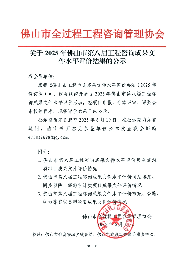 赢博(股份)有限公司官网2025年佛山市第八届工程咨询成果文件水平评价结果的公示