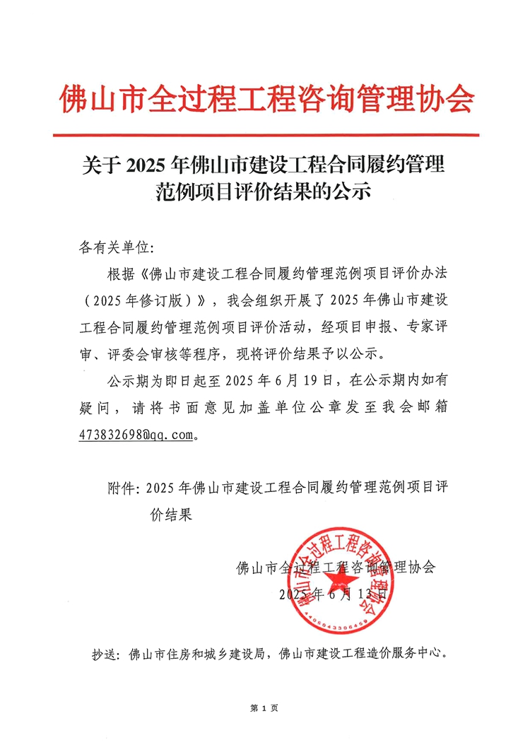 赢博(股份)有限公司官网2025年佛山市建设工程合同履约管理范例项目评价结果的公示