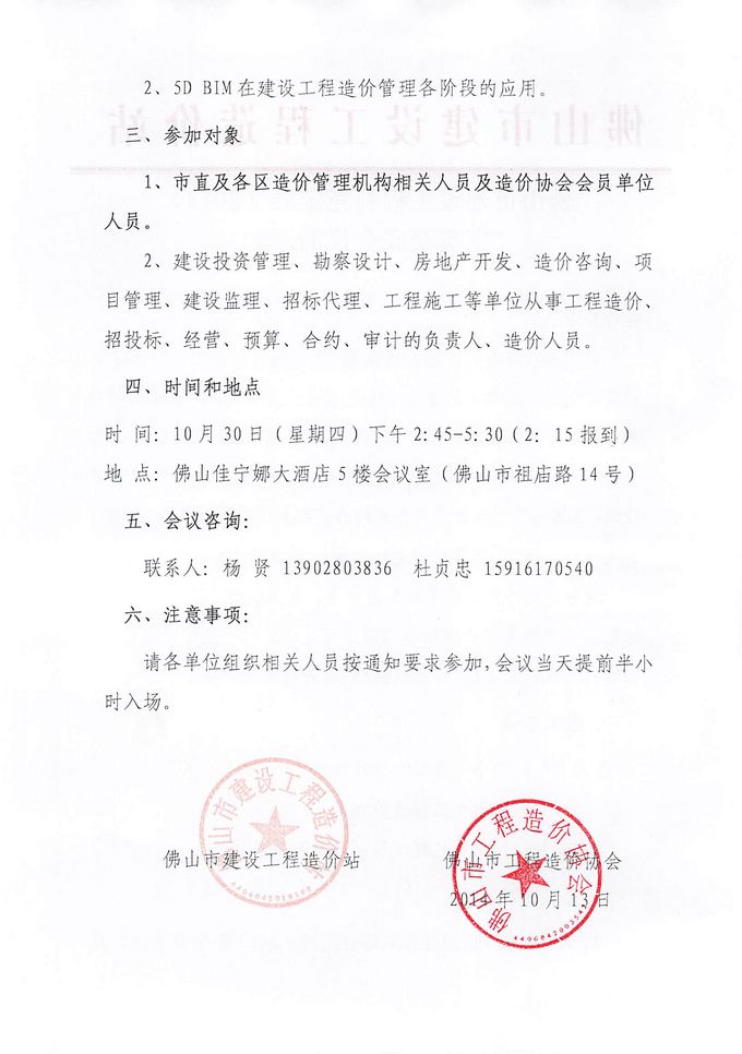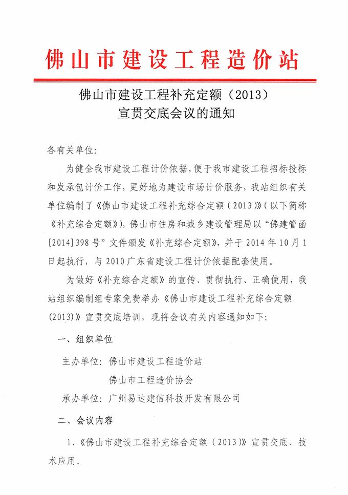 佛山市建设工程补充定额(2013)宣贯交底会议的通知
