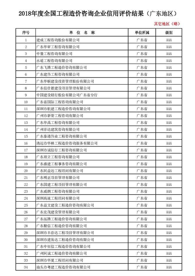 根据中国建设工程造价管理协会《工程造价咨询企业信用评价办法》及《工程造价咨询行业信用评价标准》的有关规定,我们组织开展了2018年度全国工程造价咨询企业信用评价工作。经企业申报、省级工程造价管理机构初评,中价协组织专家终审,现将2018年度全国工程造价咨询企业信用评价结果予以公示。