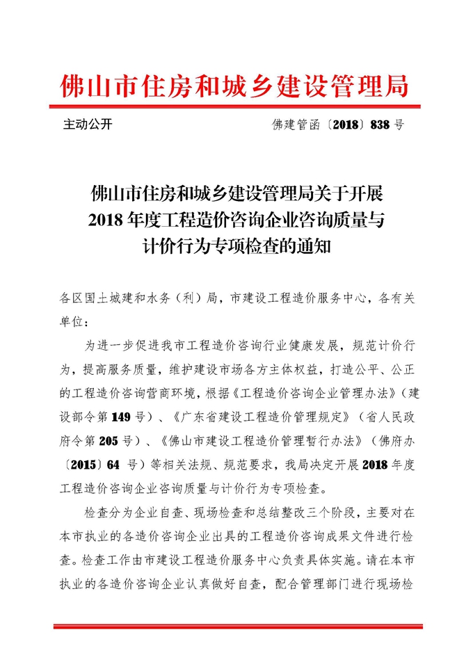 佛山市住房和城乡建设管理局赢博(股份)有限公司官网开展2018年度工程造价咨询企业咨询质量与计价行为专项检查的通知