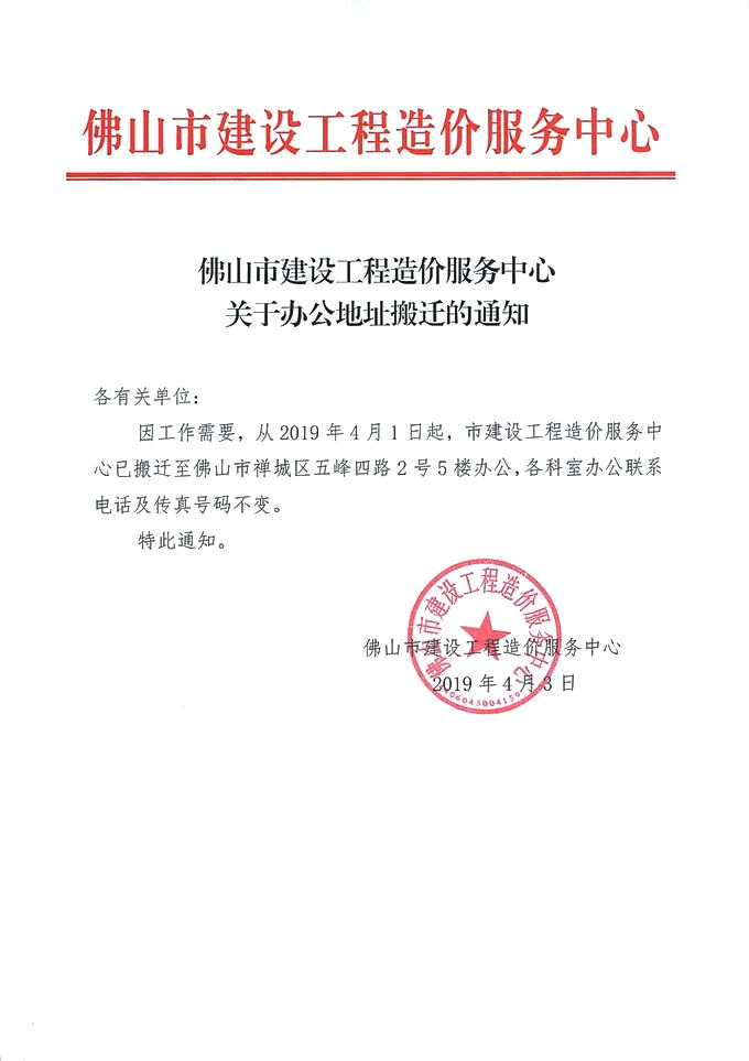 佛山市建设工程造价服务中心赢博(股份)有限公司官网办公地址搬迁的通知