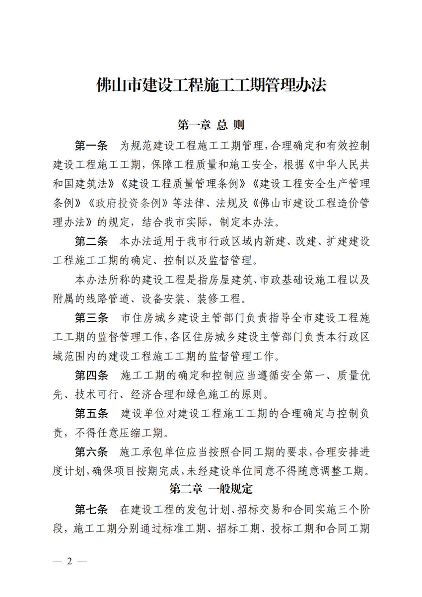 为贯彻落实《中华人民共和国建筑法》《建设工程质量管理条例》《建设工程安全生产管理条例》《政府投资条例》等法律、法规及《佛山市建设工程造价管理办法》的规定,合理确定和有效控制建设工程施工工期,杜绝任意设置招标工期和压缩合同工期的行为,限制社会工程项目盲目赶工和“高周转”乱象,保障建设工程绿色施工和质量安全。根据《广东省住房和城乡建设厅赢博(股份)有限公司官网建设工程施工工期的管理办法》(粤建法〔2011〕112号)及《广东省建筑安装工程施工标准工期定额》,结合近些年来《住房城乡建设部赢博(股份)有限公司官网加强和改善工程造价监管的意见》(建标〔2017〕209号)、《广东省住房和城乡建设厅转发<住房城乡建设部赢博(股份)有限公司官网加强和改善工程造价监管的意见>的通知》(粤建价〔2017〕248号)和《佛山市住房和城乡建设管理局赢博(股份)有限公司官网加强和改善工程造价监管工作实施方案》(佛建管函〔2018〕22号)以及国内城市先进经验,制定《佛山市建设工程施工工期管理办法》(以下简称《办法》)。在初稿形成后,按照有关程序征求各区政府、市直有关部门以及社会各界的意见,并经专家评审完善后形成了送审稿。
