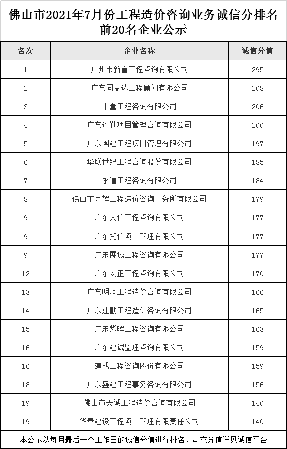 佛山市2021年7月份工程造价咨询业务诚信分排名前20名企业公示