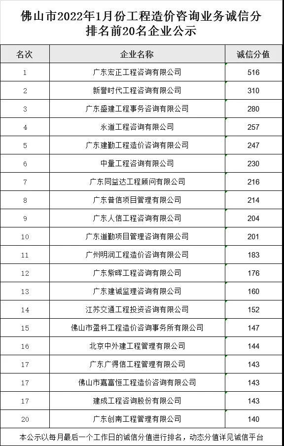 佛山市2022年1月份工程造价咨询业务诚信分排名前20名企业公示