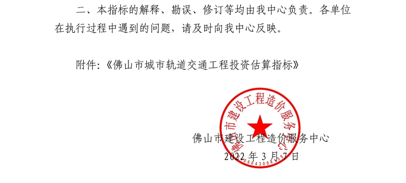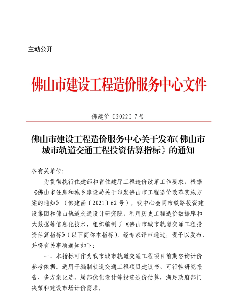 佛山市建设工程造价服务中心赢博(股份)有限公司官网发布《佛山市城市轨道交通工程投资估算指标》的通知