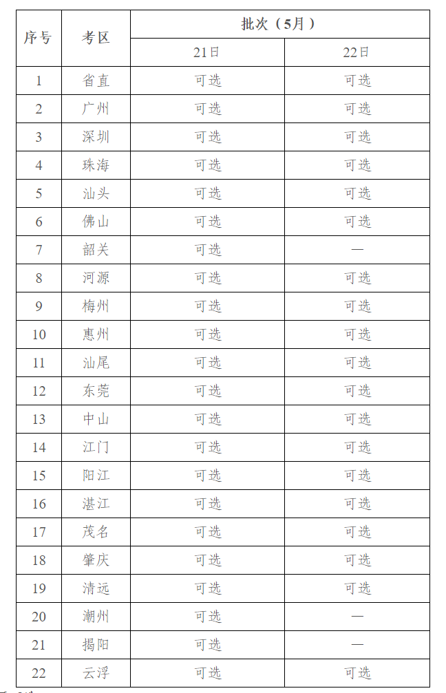 5月21、22日每日安排1个批次,共2个批次。各考区的批次安排不同,具体详见附件2。