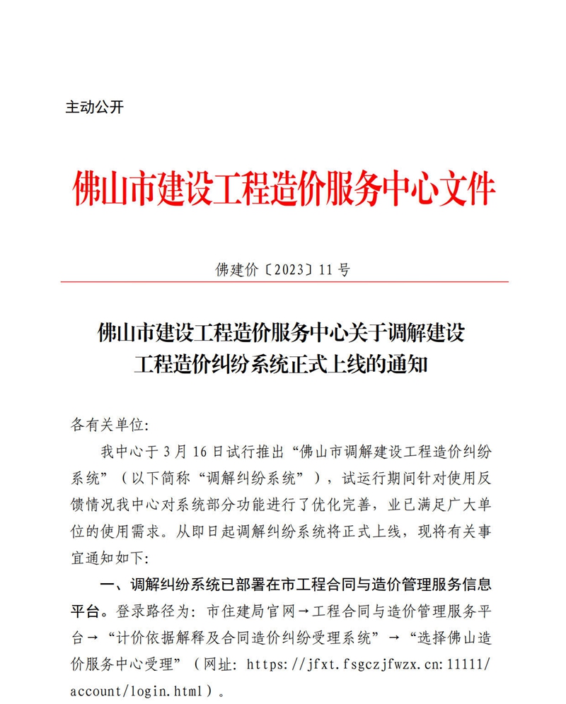 佛山市建设工程造价服务中心赢博(股份)有限公司官网调解建设工程造价纠纷系统正式上线的通知