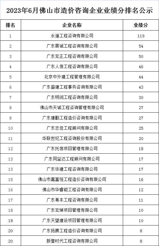 2023年6月佛山市造价咨询企业业绩分排名公示
