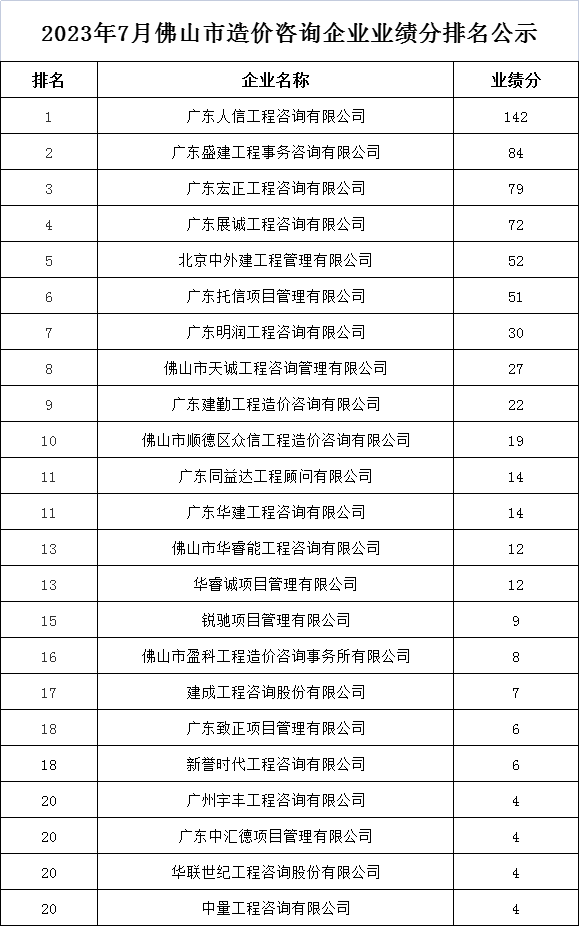 2023年7月佛山市造价咨询企业业绩分排名公示